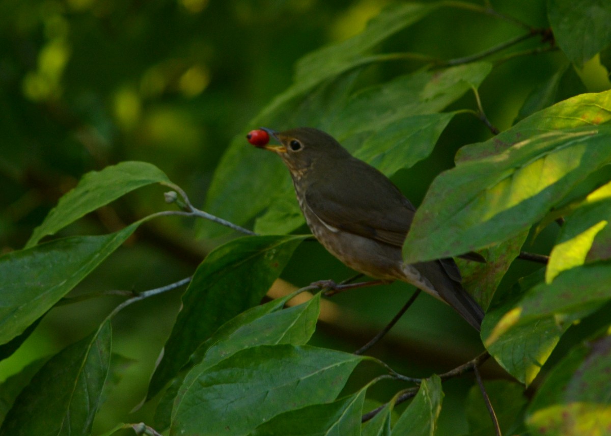 These small thrushes (smaller than a robin, anyway) have been cleaning the berries off of a dogwood tree near the house: