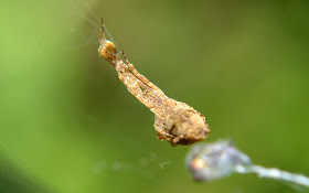While I was in the garden the other day, taking pictures of bugs, I noticed a small spider web tucked away under a leaf. Hanging in the center of the web was what looked at first glance like a dried leaf, or possibly a stray bit of bark: